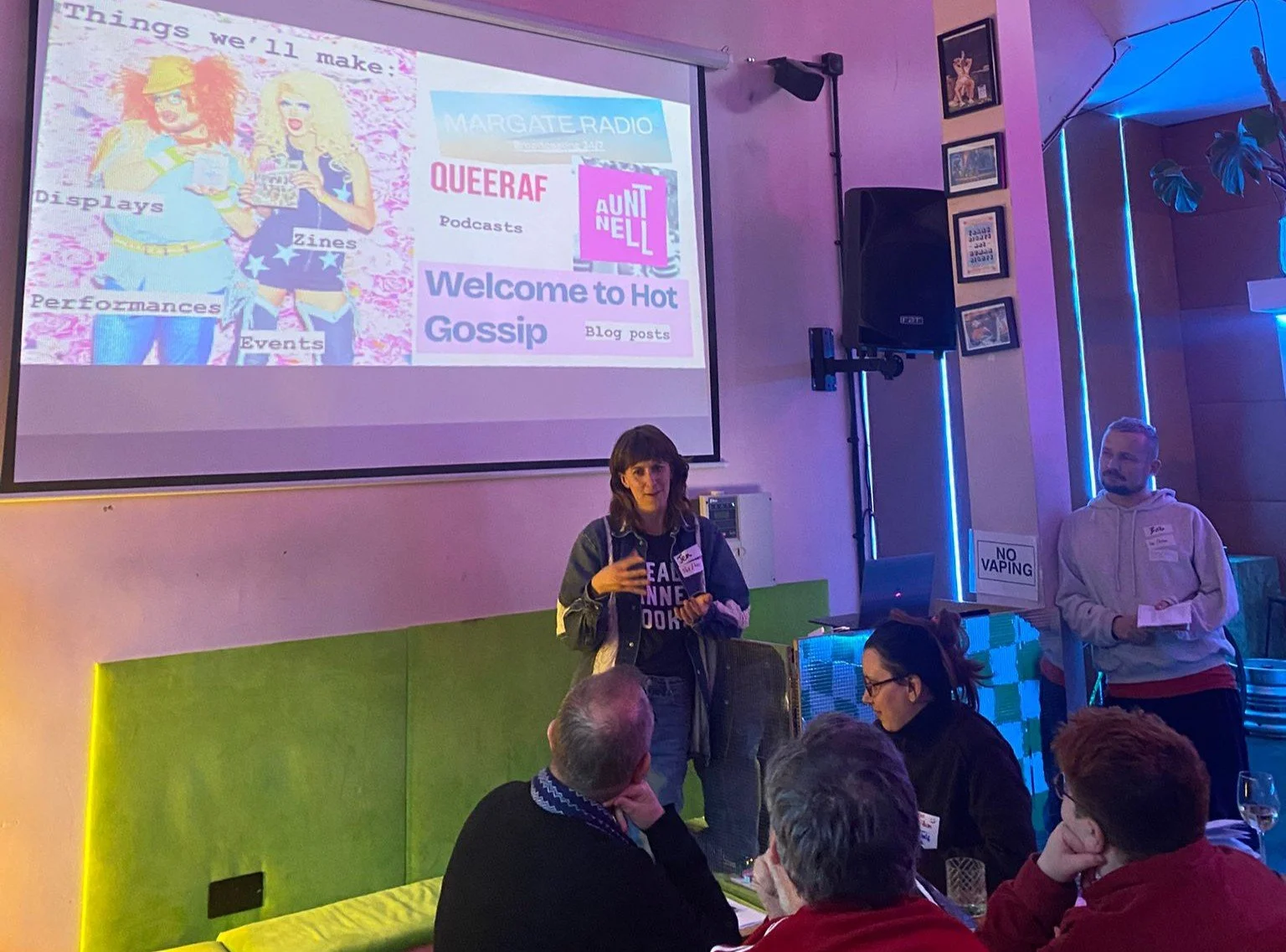 Since it was our first session, we had obligatory name and pronoun stickers (not gonna lie, we’re probably going to have them every session) and then I enforced a somewhat cringe icebreaker, asking people to write a fun/interesting/any fact about themselves that they would be happy to share with the rest of the room. I went down the LinkedIn route and put part of my CV on my label. I worked for Gay Times for ten years! And Jen provided credentials explaining her Drag Files project. Some embraced the fun/interesting fact challenge and we discovered we had a fourth place Mr Gay UK entrant in our midsts! Someone had a wind farm named after them! And others indulged us in the real reason behind the warm up, finding out their background, skills and what brought people to the session. It was wonderfully surprising to be in a room full of so many inspirational and talented people. We had a whole bunch of academics and people skilled at organising from all kinds of backgrounds, and what tied us all together was a shared interest in discovering and preserving Thanet’s queer heritage through a healthy love of gossip. And there was pizza, but that came after, a reward for having been subjected to an ice-breaker warm up game.